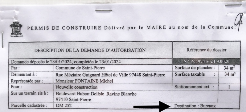 Là, c’est irréel, selon ce permis de construire qui serait daté du 19 avril 2024, le bétonnage en cours en haut de plage de Ravine Blanche, sur le Domaine Public Maritime, aurait pour objet de créer des … « Bureaux » … Oui, vous avez bien lu, Destination : Bureaux !